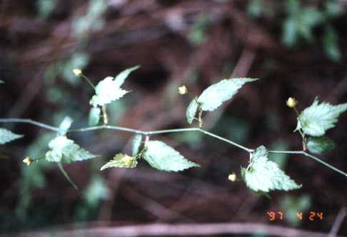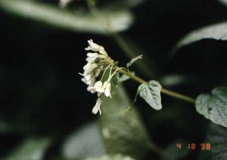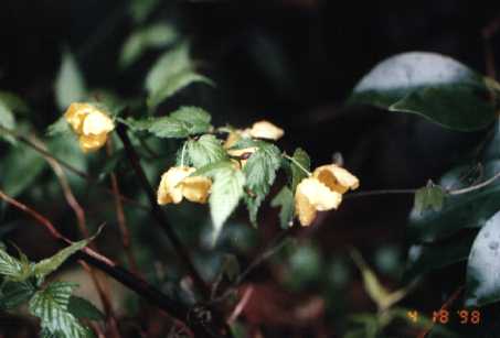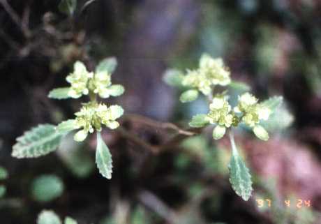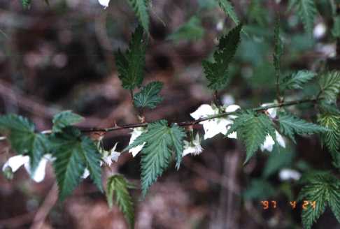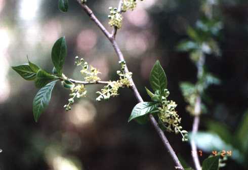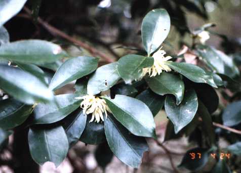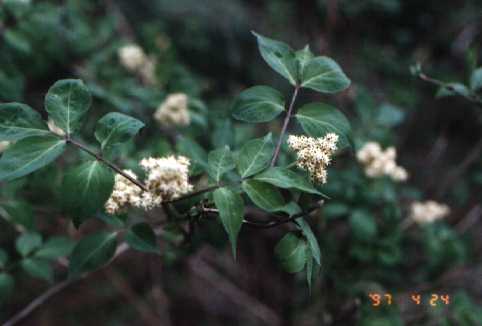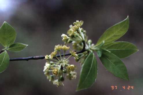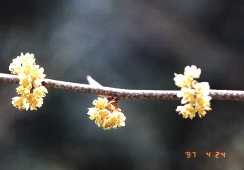 落葉の低木。葉の表面光沢有り。臭気を出す。4月末に花をつける。雌雄異株。