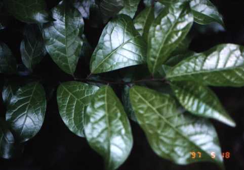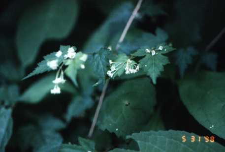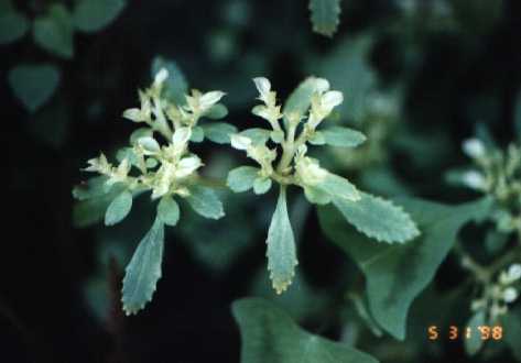 落葉の低木。葉の表面光沢あり。臭気を出す。4月末に花をつける。雌雄異種。