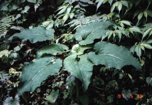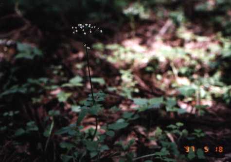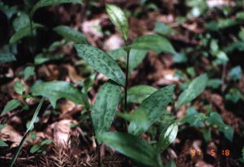 木の下の日陰に多い。5月頃、白色に紫の斑点のある花をつけるが果実はできない。