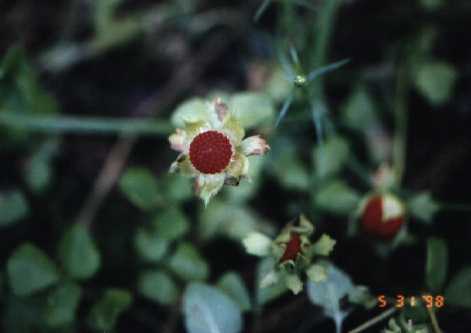 道ばたに生える多年草。花弁5枚。紅色の果実をつける。