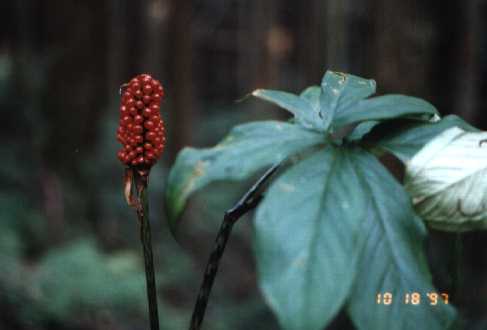 茎が「まむし」の模様に似ているので「マムシグサ」という。秋になると赤色の実ができる。