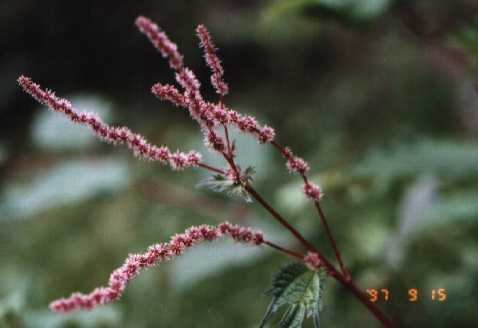 山地に生える多年草。茎が赤く葉には大きなギザギザがあり先端はとがる。