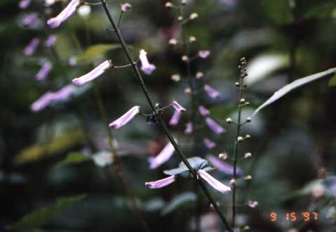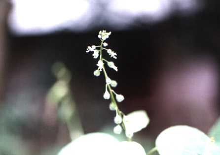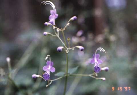 山の木陰に生えるつる草。花は淡紫色。果実は赤く熟す。