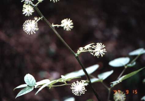 山地に生えるつる性植物。花は8~9月に開き、黄色。果実は長さ4~5cm。熟すと紫色となる。