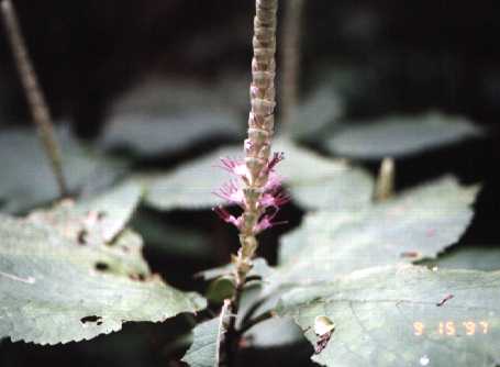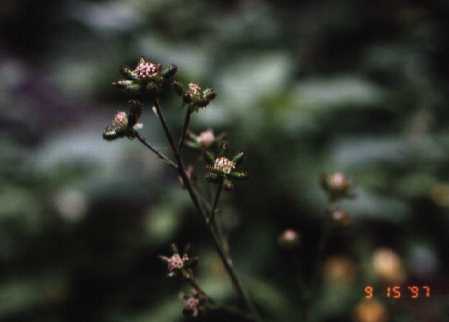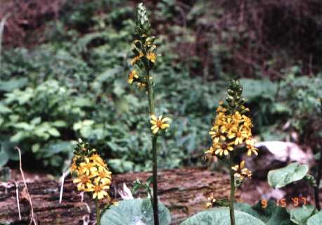 山地の樹の陰にある。根から出た葉は「ふき」に似ている。果実は、他のものによくくっつく。