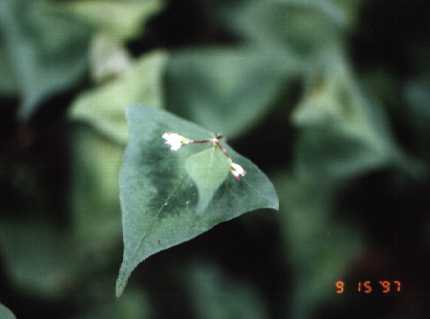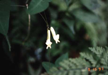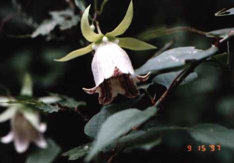 つる性で2m以上にもなる。花弁は五裂して外面は白緑色。内面は褐紫色の模様がある。