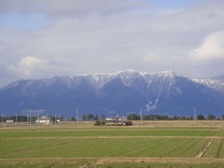 飛行場からみた、雪が積もった比良山系 ここからの比良おろしの寒さが身にしみる (051208) |