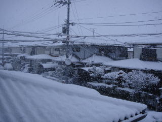 昨夜から降り続いた雪が今朝も降り続けている(二階の窓から) (090115) |