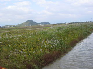 ウォーキングで歩く自転車道路沿いにコスモスの花と蕎麦の花が美しく咲いていた 八幡山もくっきりと見える (090929) |