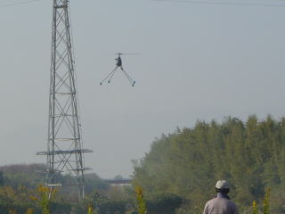 アメンボーがとれてホバリング中のスカディ50とHさん。 風が弱い時ははずし強いときは付けての安全飛行をされている。 (041207) |