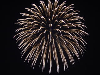 近江八幡てんびん祭りの花火が家の前、数百メートル先で打ち上げられ家の2階で撮影した 規模が小さいため迫力が小さいのが残念だ (前の家が黒く見える) (060806) |