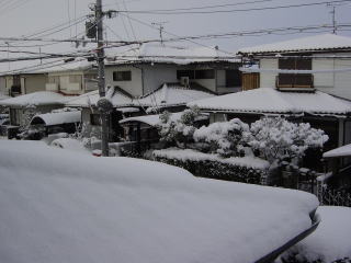家の2階から右側の雪景色、下部はあきら家の1階屋根 (050121) |