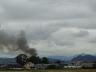 火災! 10時半頃整備された飛行場に行く途中で出くわした(野村町?) 約1時間後に鎮火したようだが木造で全焼したのでは? 火の用心! (080623) |