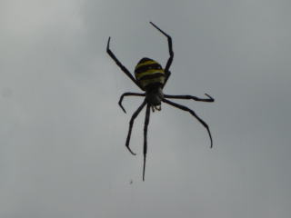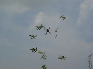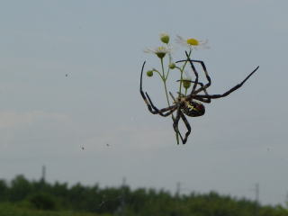 蜘蛛(女郎蜘蛛?)の巣に花を引っ掛けたら足で上手に取り外して下に落とした お見事! (080702) |