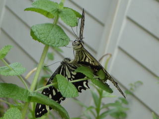 家庭菜園でアゲハチョウの交尾中を見つけた お楽しみ中お邪魔しました (080708) |