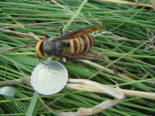 飛行場にあるクヌギの木の下に死んでいたスズメバチ、でっかい! こんなに大きいスズメバチに刺されたら死ぬわ! (080726) |