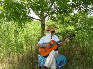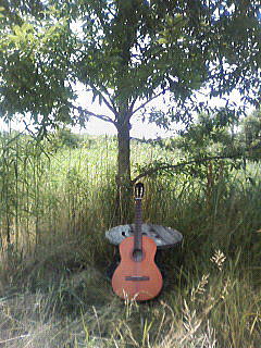 あきら君のギター練習場 飛行場にあるクヌギの木の下で(飛行の合い間に)暑さも避けられ気持ちの良い練習が出来る最高の場所だ! (090617) |