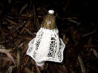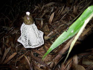 MSYさんのコメント 梅雨時期の楽しみは、毎年麗美な姿を見せる 「衣笠茸」を見つけました。 この茸は竹やぶに生息しており、きのこでなく 竹の子ではないか?とさえ疑問を持つ。 (040704) |