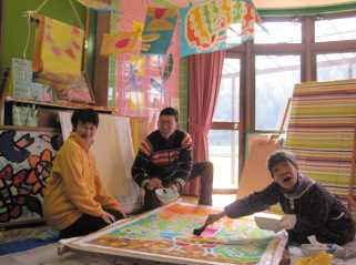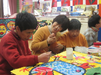 小さく切った布を何重にも重ねて貼って、一つの作品を創っていきます。