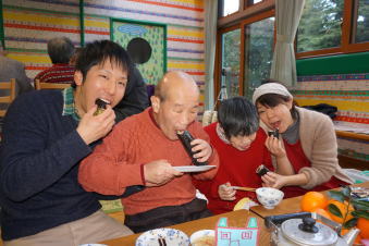 朝早くから、炊事の先生が作って下さった手作りの恵方巻きを「今年一年皆が元気で過ごせますように・・・」と皆で頬張りました。