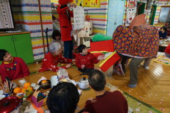 全部が歌い終わったところで豆まきをしました。 獅子舞さんも登場。獅子舞に頭を咬まれると病気しないんだそうです。
