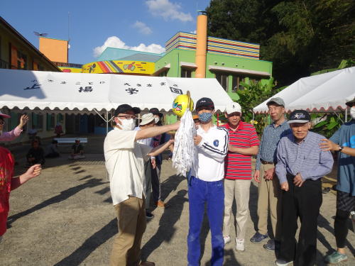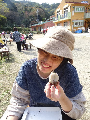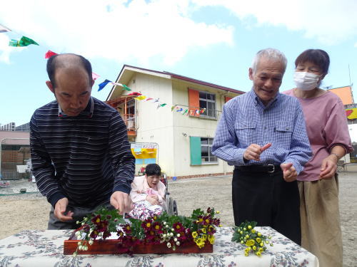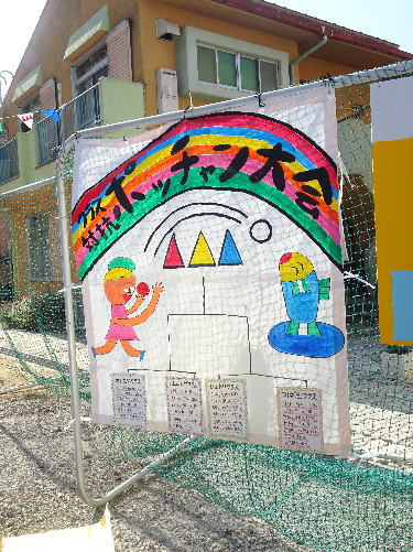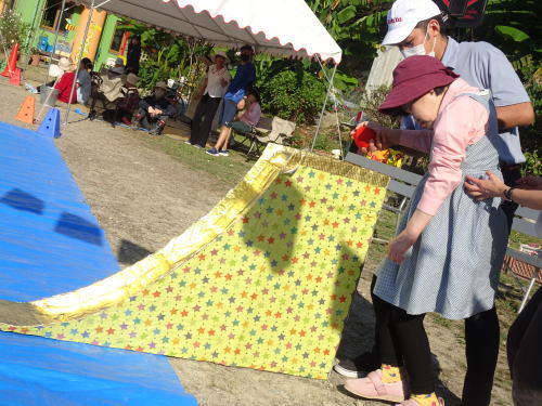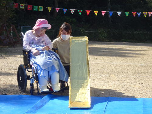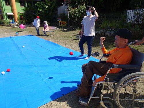 午後からは、新しく生まれ変わったグランドで「ボッチャ」というボールを使った競技を止揚学園風に「ぽっちゃん大会」とアレンジして、金色の鯉(金色のボール)に餌をあげましょう・・ということで、一人ひとり紅白の球を投げたり、転がしたりしました。