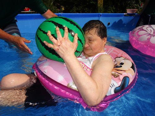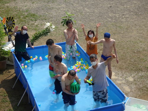 止揚学園の大きなプールが経年劣化のため、また給水・排水工事などが必要となり現在使用出来ないため、今年は簡易プールに少人数で順番に入り涼をとっています。