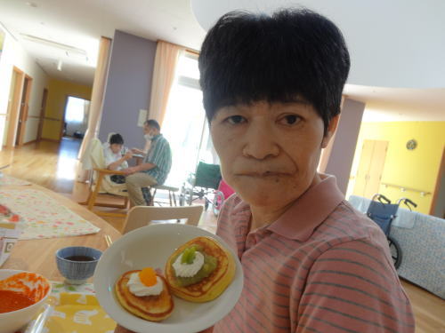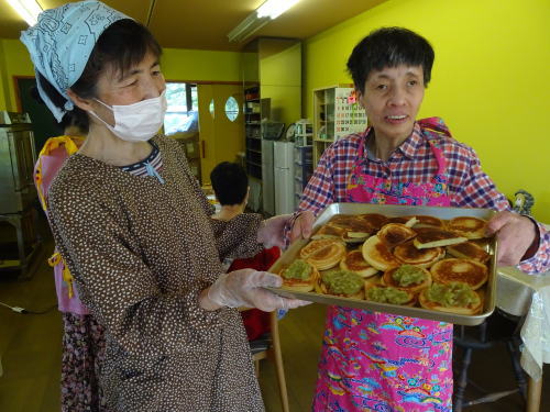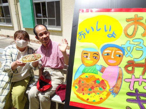 蒸し焼きにする蓋は職員の手作りです。外はカリカリ、中はフワフワのとっても美味しいお好み焼きが出来、皆で舌鼓を打ちました。