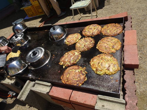 大きな鉄板を出して焼きそばをしている様子を前回お届けしましたが、この大きな鉄板だと全員分のお好み焼きも出来るだろうと、お好み焼き大会をしました。