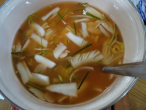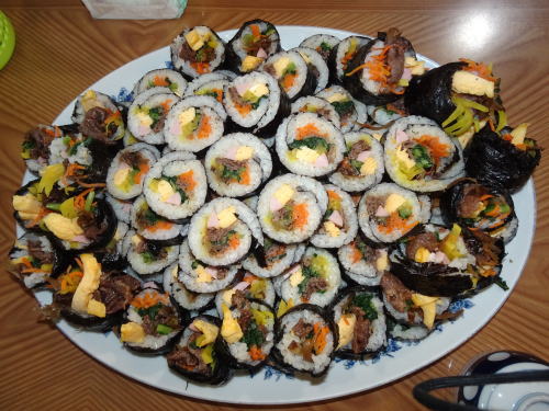 今日の献立はキムパップ(海苔巻き)とポッサム(豚肉料理)とムルキムチ(水キムチの冷たくて酸っぱいスープ)です。