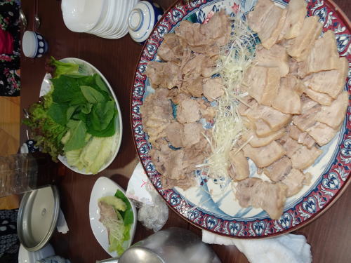 チシャ(菜っ葉)に豚肉をはさんで味噌をつけていただきます。