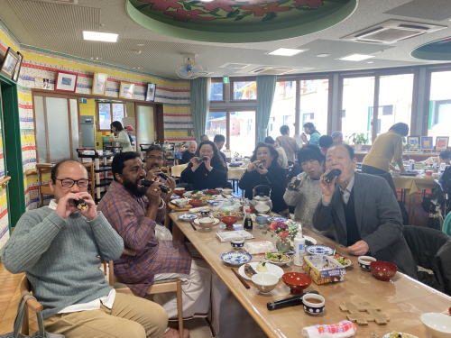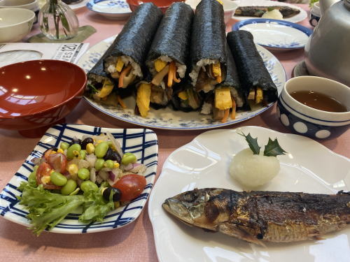 今年の惠方は東北東でした。皆で東北東に向かってがぶり!!インドから来られているヴィノウドさんとクリアンさんも初の恵方巻。
