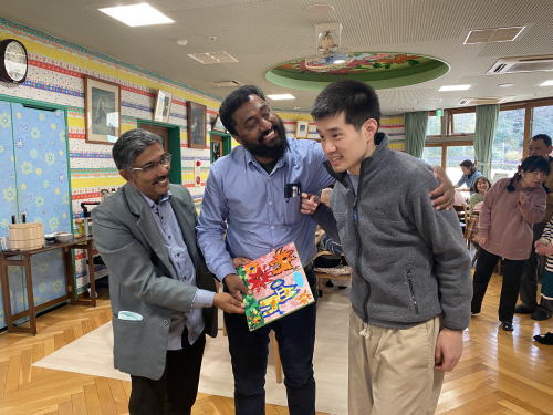 2月7日、3週間共に過ごしたヴィノウドさん、クリアンさんとお別れの日。みんなで創った貼り絵をナバジョティスクールの皆さんにプレゼントしました。