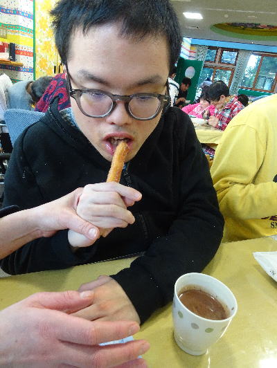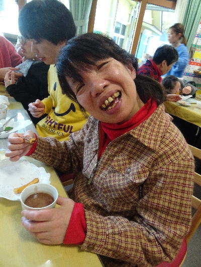ほっとバレンタインデー 今日はバレンタインデーです。 止揚学園では皆でチョコレートを食べる日です。 手作りチュロスとチョコレートを刻んで作ったホットチョコレートでほっとしています。 みん-な笑顔です(#^^#) 今日は東寺様より4名の方がおいで下さり楽しい食事のひと時を持ちました。 4年ぶりにご一緒にテーブルを囲めて嬉しかったです。宗教を超えいつも私たちをお支下さり感謝です。 毎日ドライブや散歩にお出かけしています。 もうそこまで春が来ています・・・