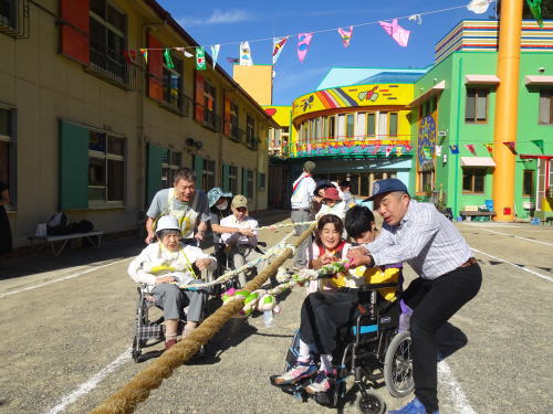 綱引き・リレーの競技 皆が参加できるように工夫がされています。