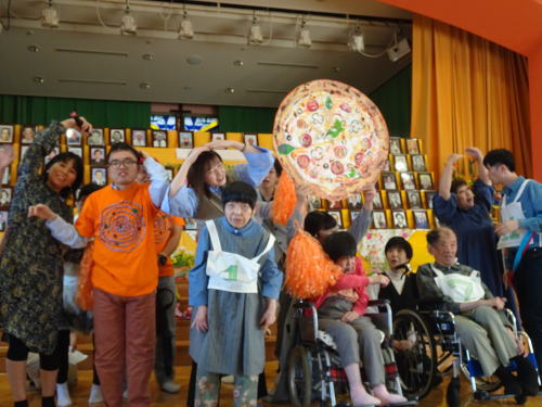 「円(まる)だいすき!!」とまるにちなんだピザチーム・車チーム・花チーム・浮き輪チームに分かれて入場行進をしました。