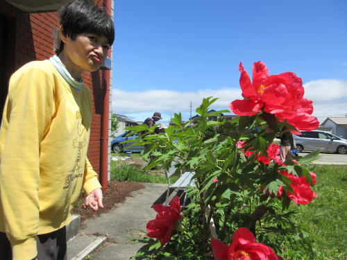 働く家の玄関出はボタンが美しく花開いています。みつこさん見とれています。