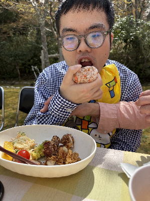 定番のお花見献立。おにぎり、唐揚げ、卵焼き、ポテトサラダ、プリンに舌鼓・・・
