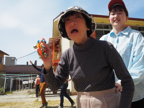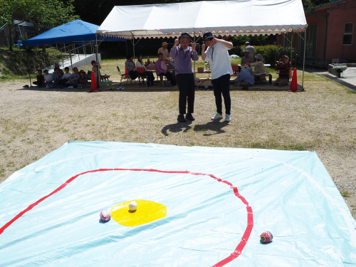 ボールを投げて円の中心にボールが残ったチームの優勝です。勝ったチームには素敵な商品があるとか?