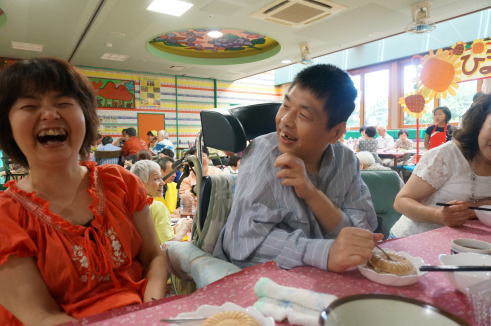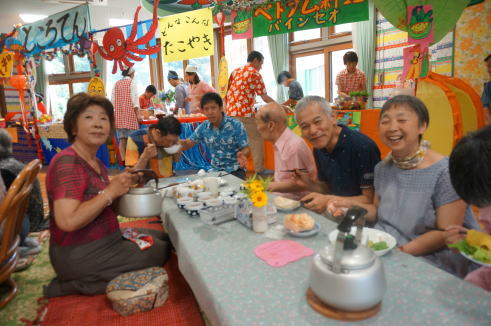 7月10日恒例の屋台めぐりをしました。職員が屋台で料理をつくって、親の方や兄弟姉妹の方が屋台をめぐりをします。
