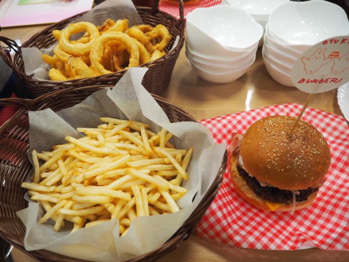 献立はお月見にちなんで、月見バーガー、オニオンリング、フライドポテト、かぼちゃのスープ(ウサギのクルトン添え)お月見饅頭です。パンは近くの美味しいパン屋さん「ひとつぶ」さんがこの日のために焼いて下さいました。中のお肉もこだわりぬいて焼かれていて、死ぬほど美味しかったです(^^♪