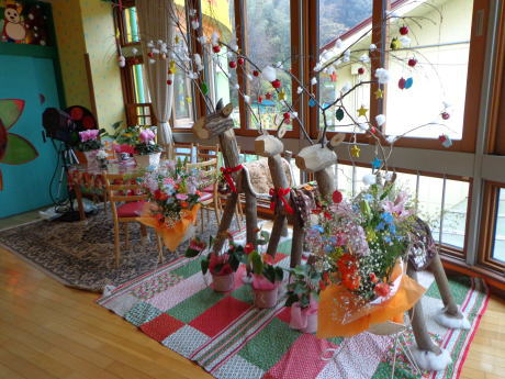 ある会社の方がプレゼントして下さった、信州の木でつくったトナカイさんも沢山の飾りと花で着飾ってクリスマスを待ち望んでいます。