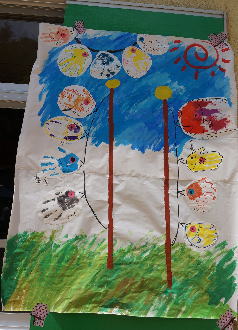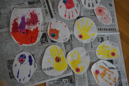 手に好きな色の絵の具を塗って、ぺたっとして目をつけると、個性豊かな可愛い鯉たちの出来上がり。