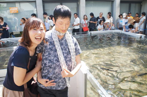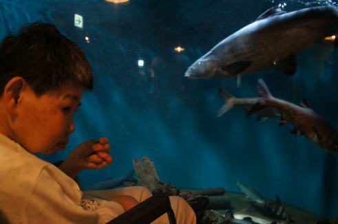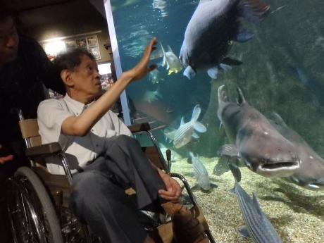 いろんな珍しい魚たちに出会いました。「こんにちわ」と魚に手を振る隆さん。