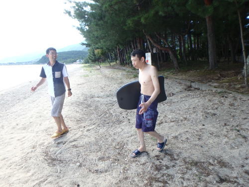 さあ、いざビーチへ。もとおさん、サーファーみたいでかっこいいヽ(^o^)丿