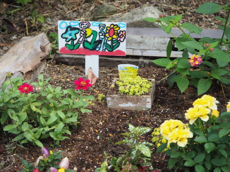 亡くなったじゅんこさんは絵を描くのが大好きで、学園の色んな所に飾ってあります。この花壇に立っているプレートもじゅんこさんの絵です。