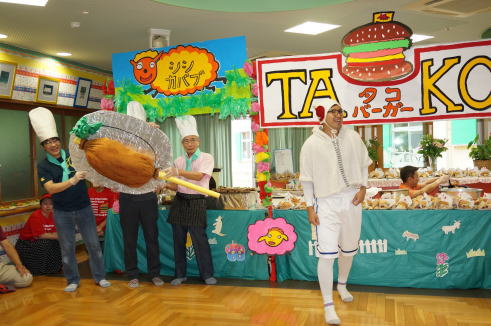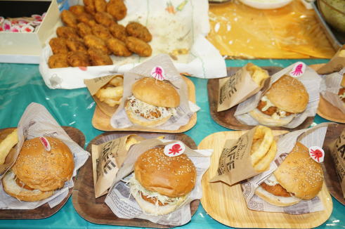 淡路島はハンバーガーが有名ですので、止揚学園オリジナルでタコを使ったハンバーガーを作りました。