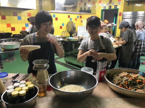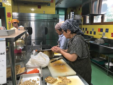 今日は、毎月お料理のご奉仕に来て下さる、近所の御婦人のグループふじの会様も来て下さっていて、調理場は賑やかです。ベテランふじの会のみなさんがいて下さるので約100人分の食事作りもスムーズです。