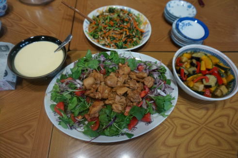クミンとチリペッパーの入った味噌に漬け込んだ鶏肉とシーザーサラダ(ドレッシングにははチーズとガーリックが沢山入っています)高野豆腐と野菜の揚げ浸し、海苔のたくさん入ったやさいのお浸しとのっぺい汁です。
