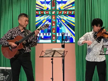 有名なジャズ・ギタリストの山口武さんが2年ぶりに止揚学園の皆に会いに来て下さり、ジャズバイオリニストのYu-maさんとコラボして演奏会をしてくださいました。もうすぐお二人のコラボのCDも出るそうです。
